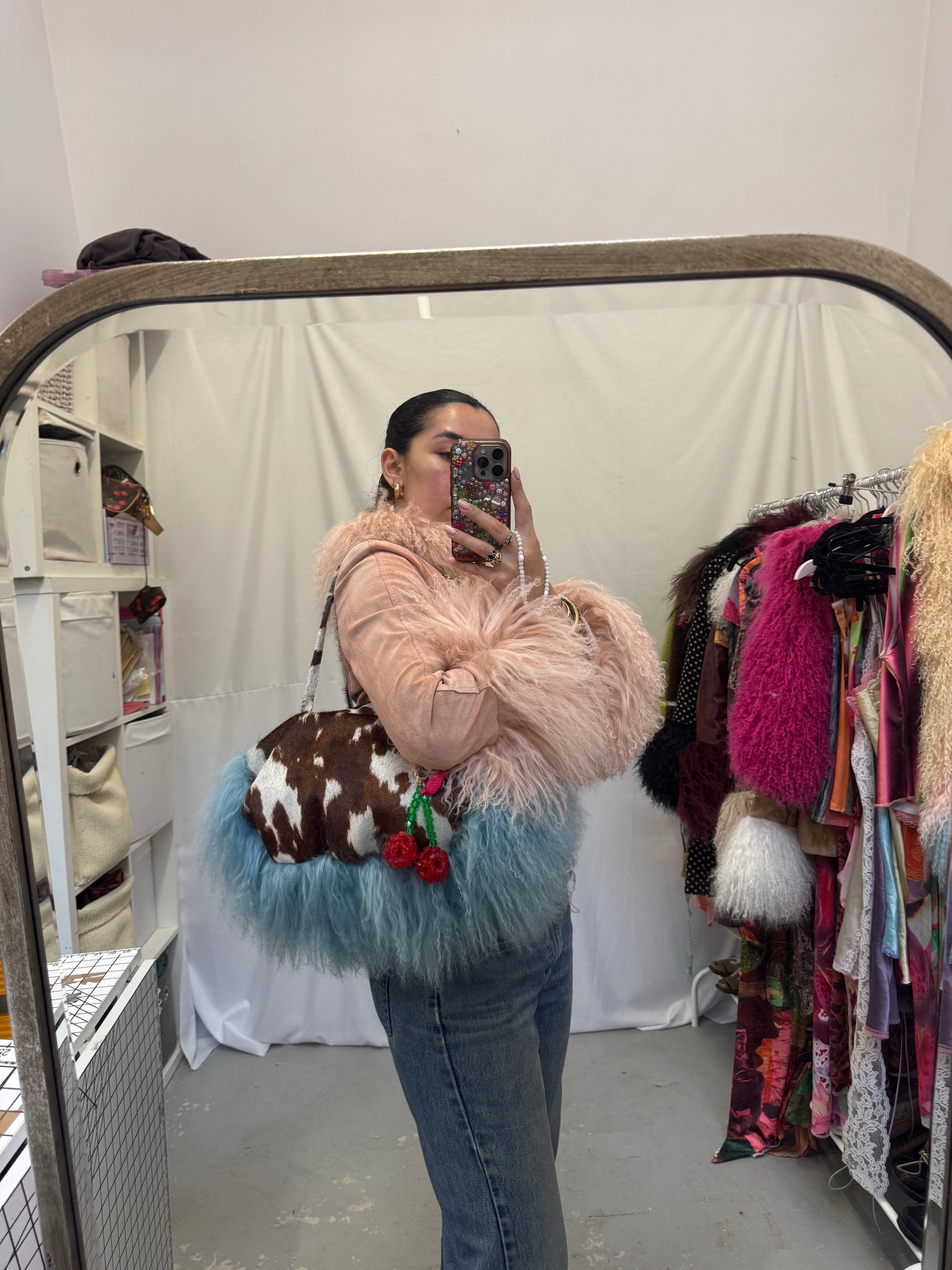 Blue Mongolian Wool Bowler Bag with Cow Print Leather 2