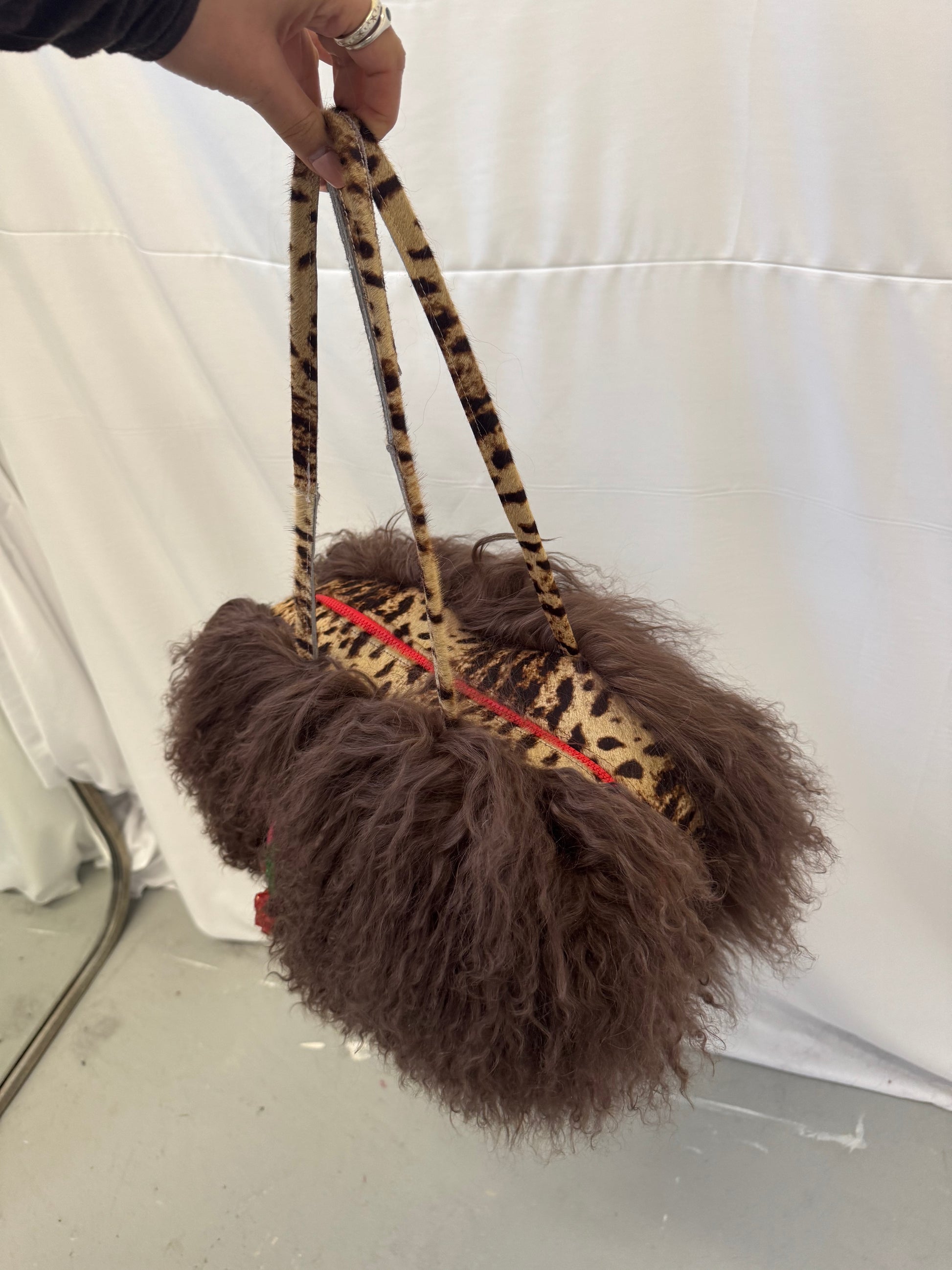 Brown Mongolian Wool Bowler Bag with Leopard Print Leather