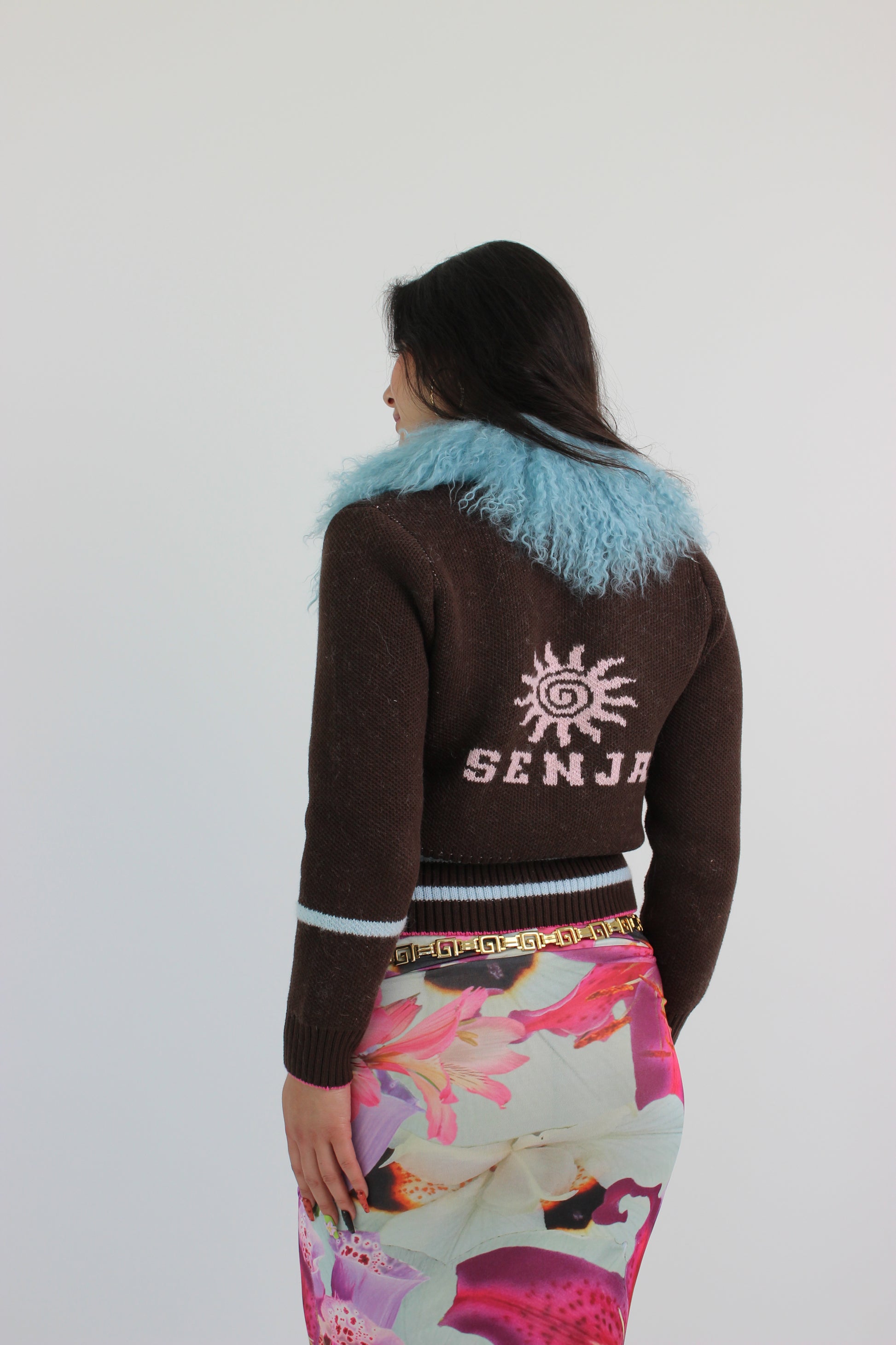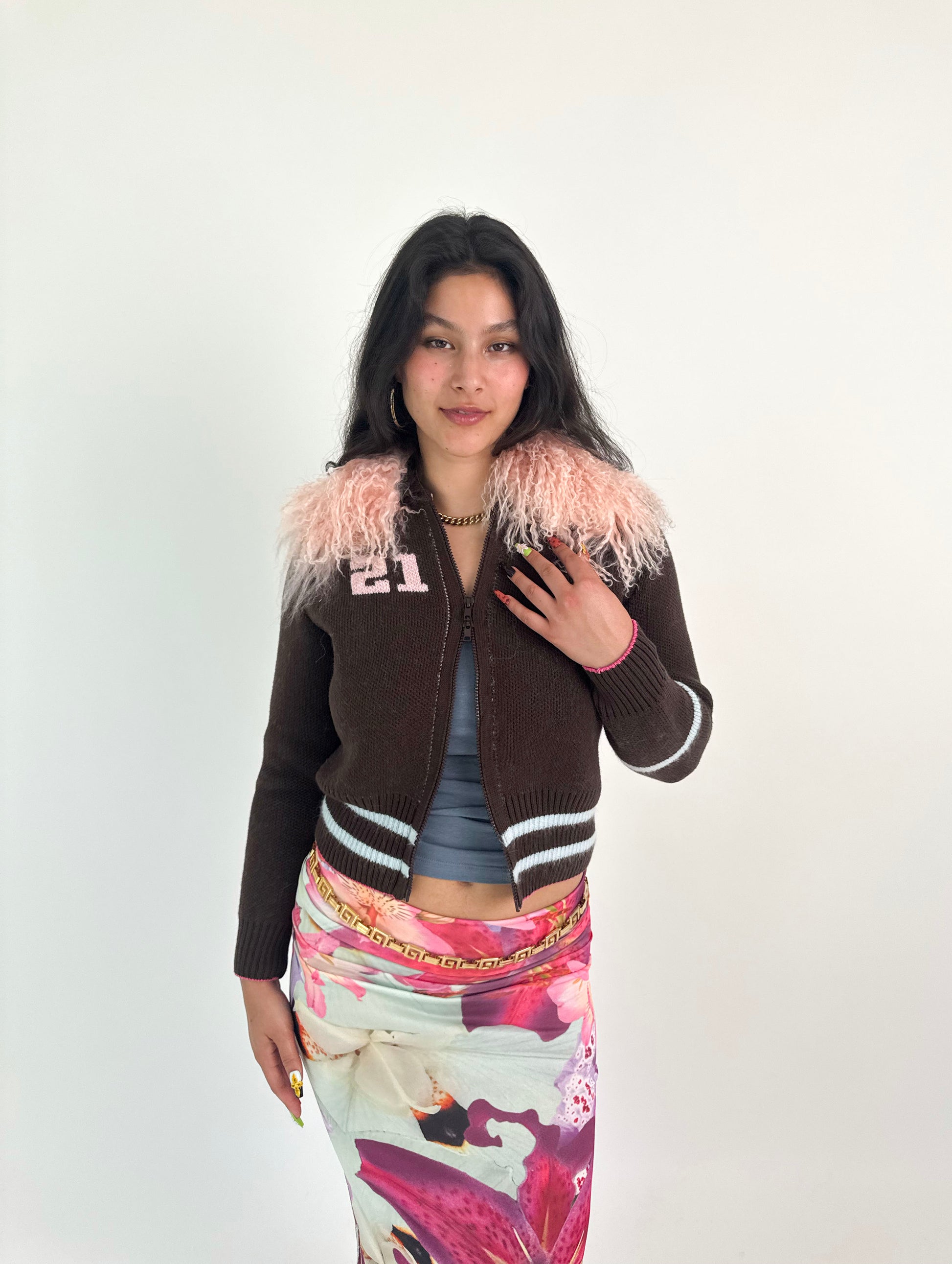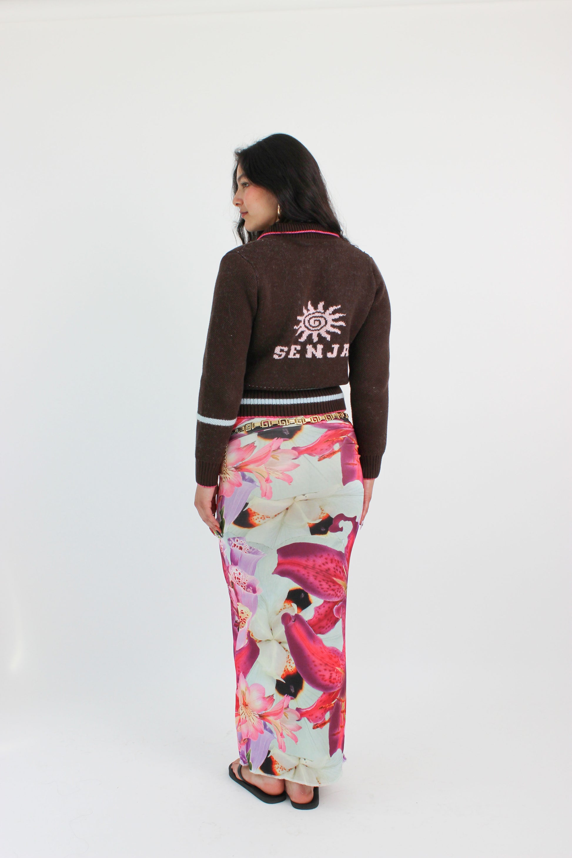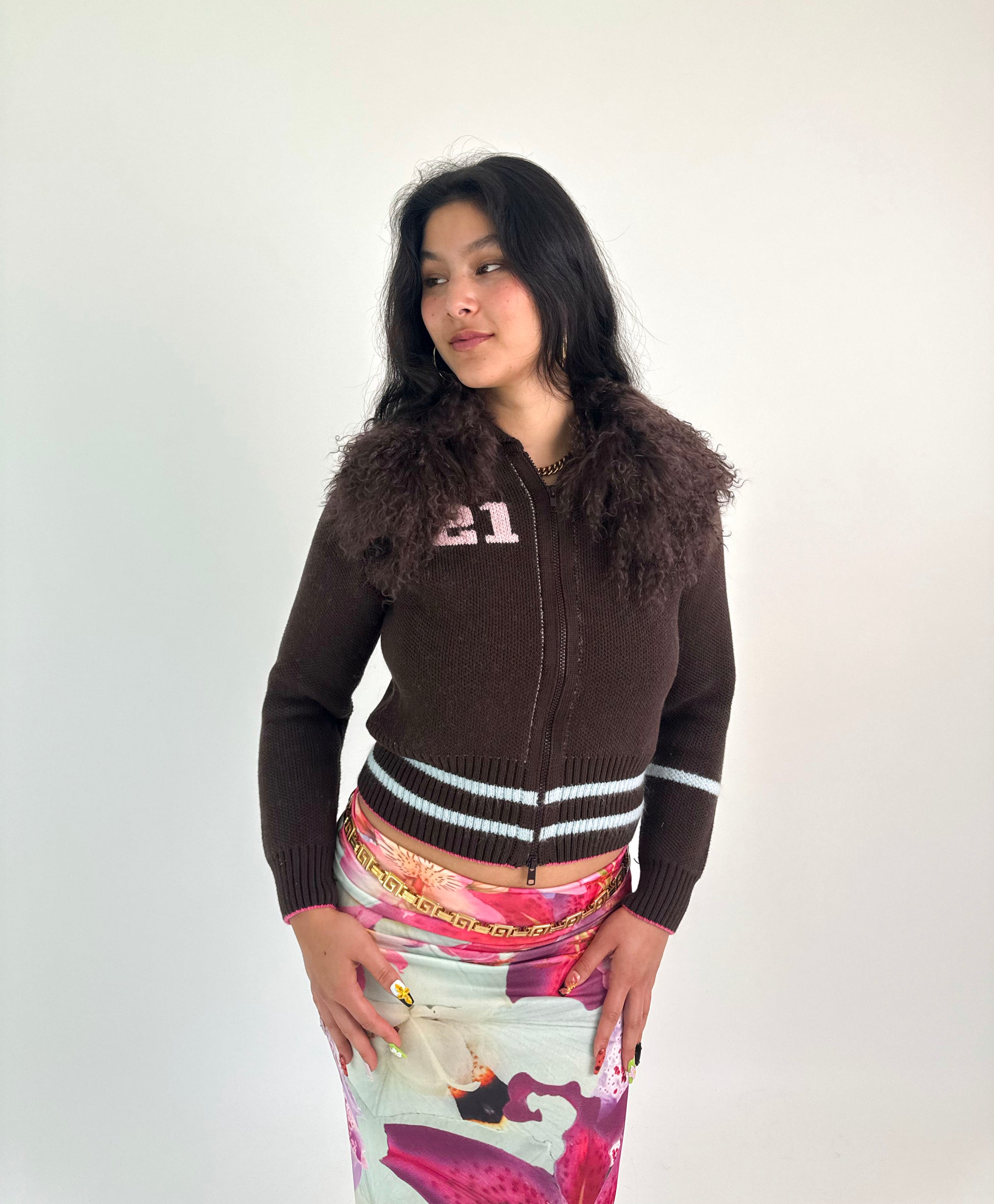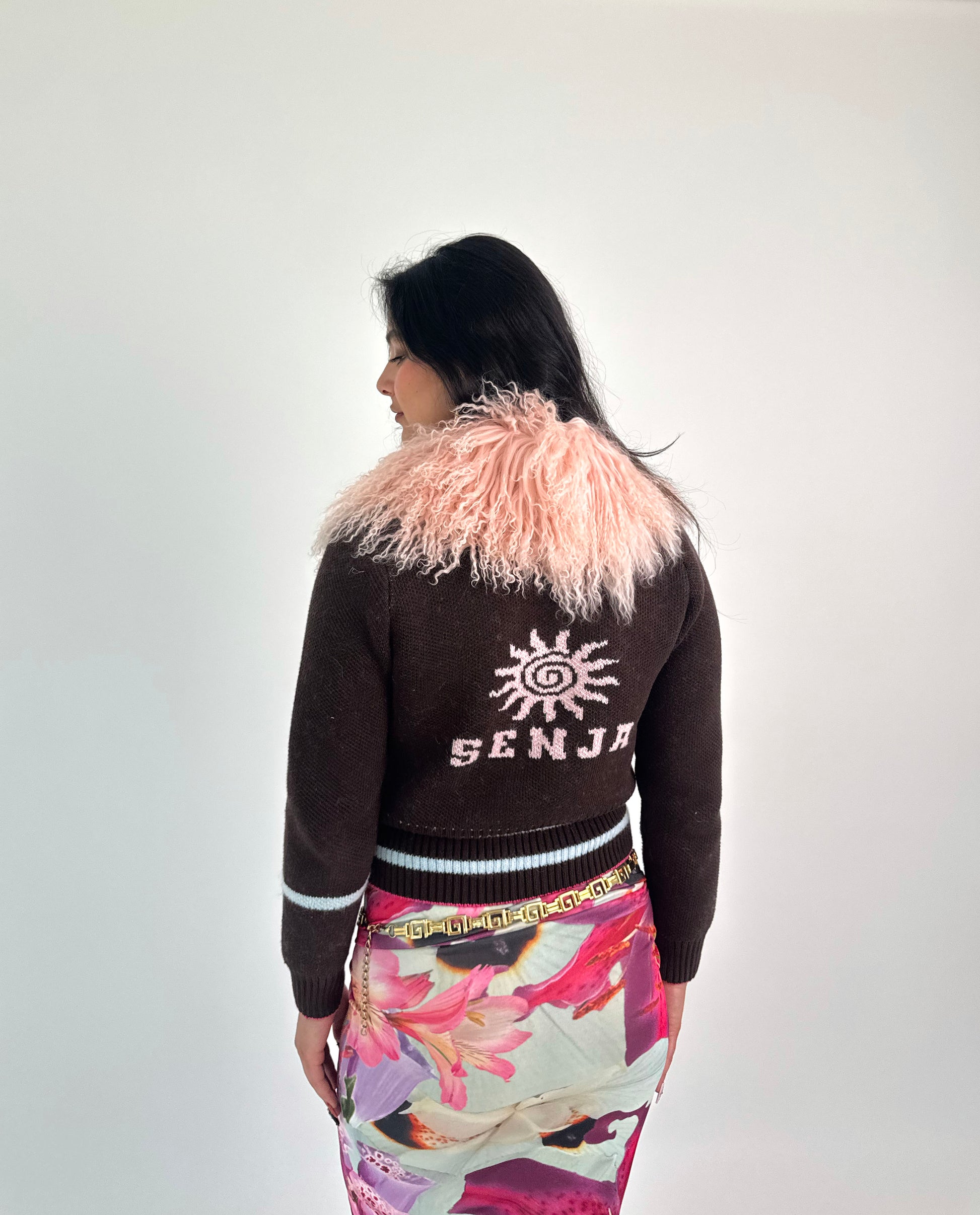 Designed by Maddie, who studied and worked as a knitwear designer before founding Senja, the piece reflects her love of considered details: a double zip front, jacquard graphics in baby pink and light blue sporty stripes. It features a ‘21’ on the chest, a nod to when Senja was founded in 2021. On the back it has ‘Senja’ and a sun motif, a celebration of the brands name and roots.