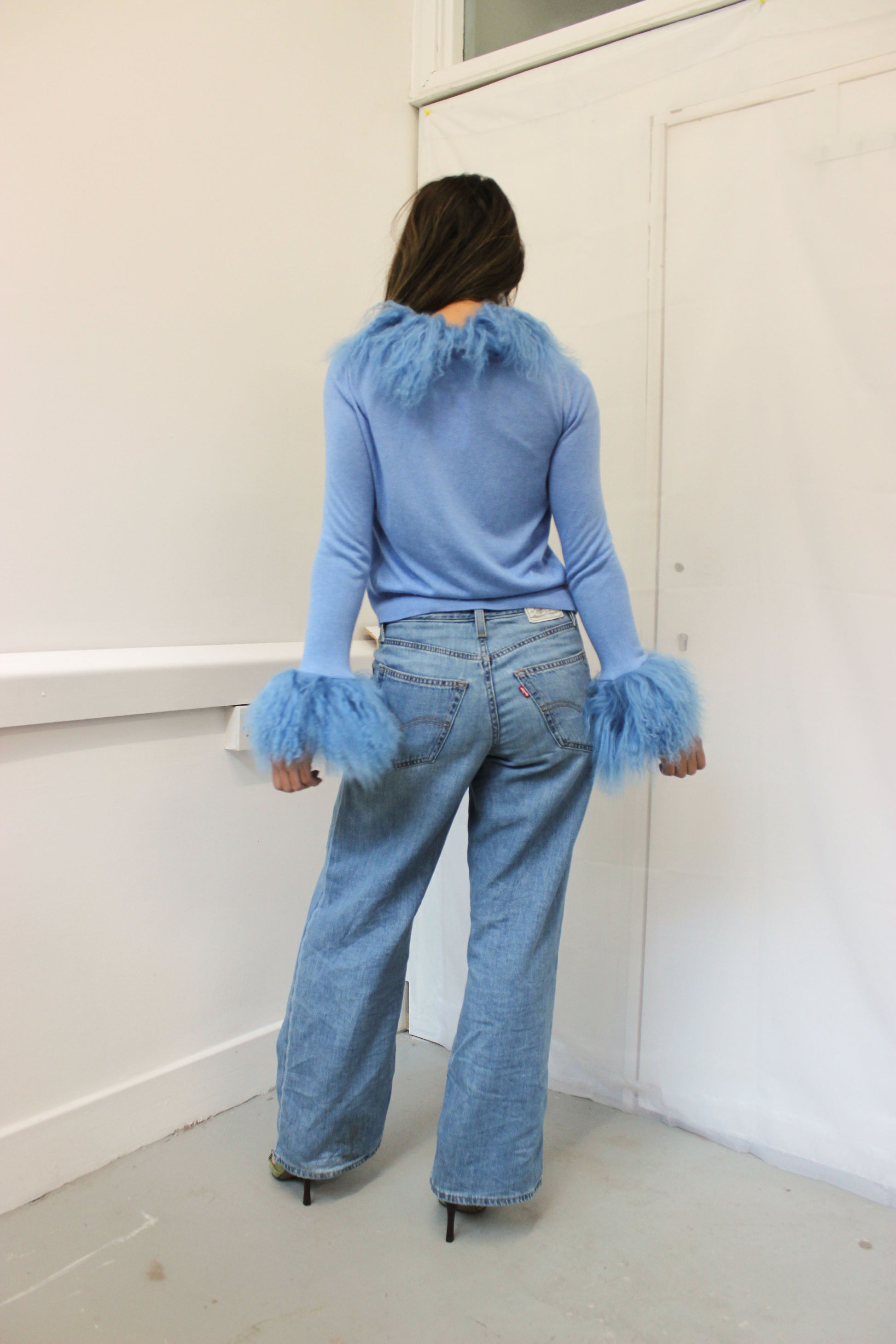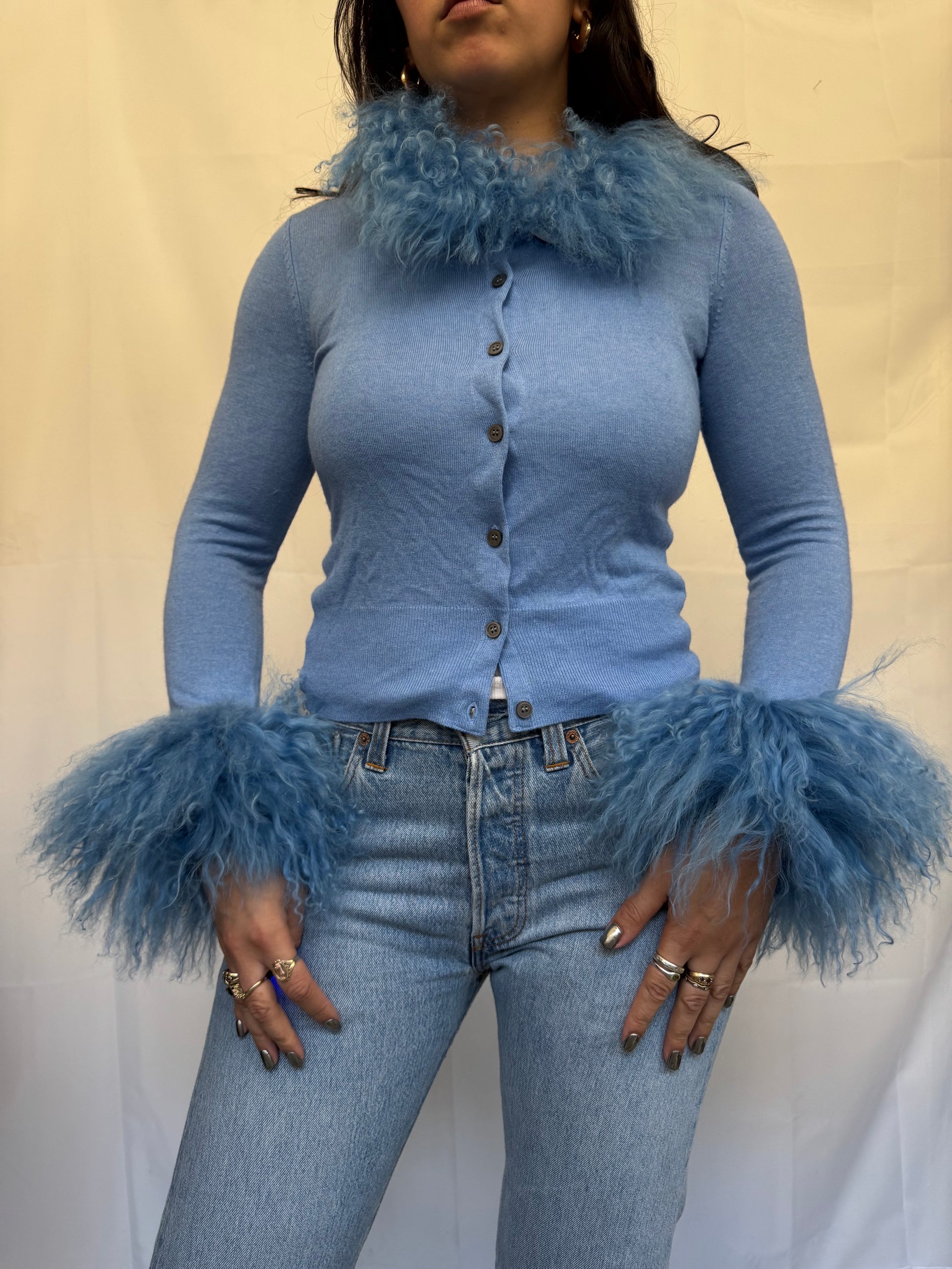 Cornflour Blue Cardigan with Mongolian Wool Trim