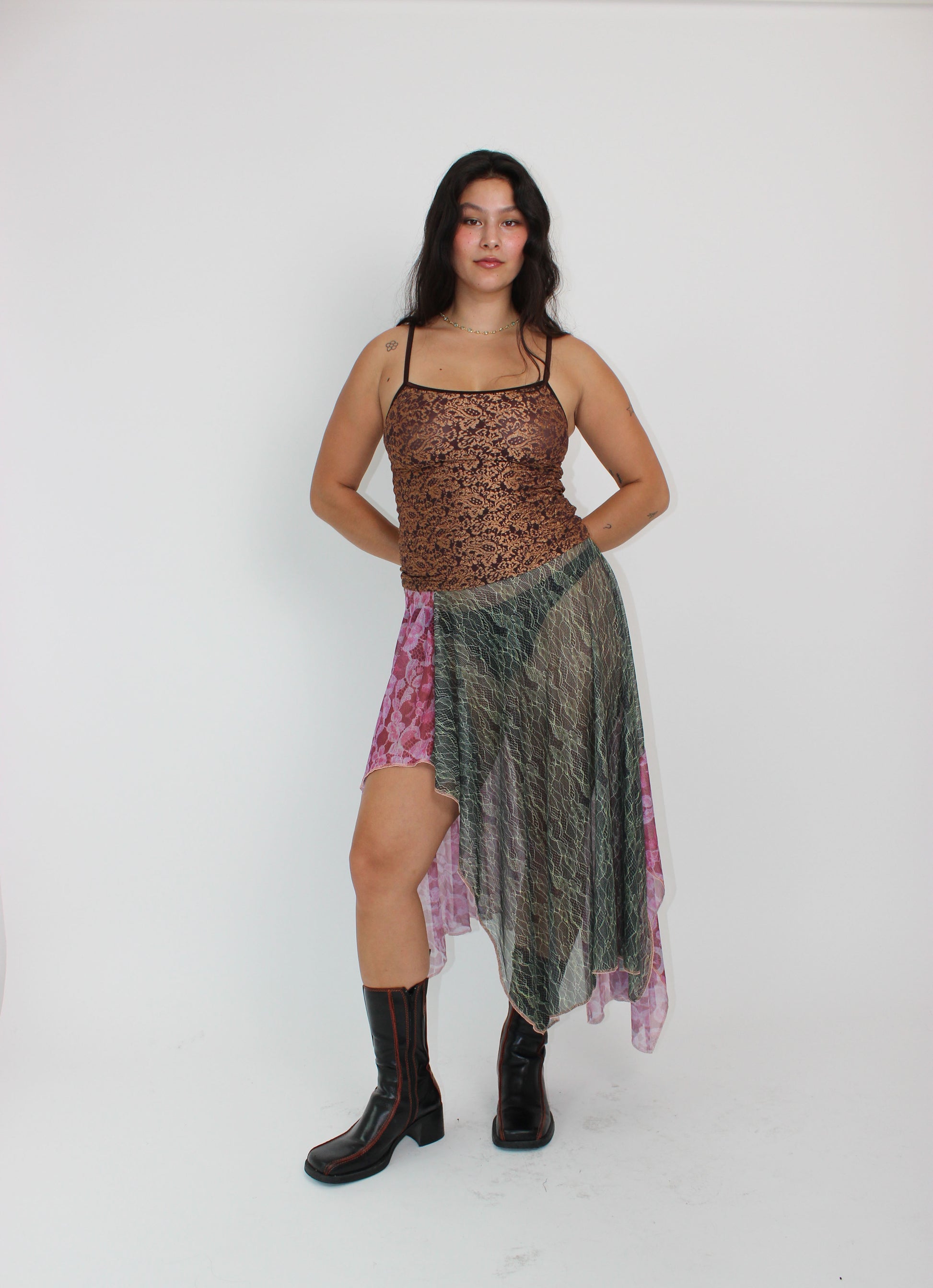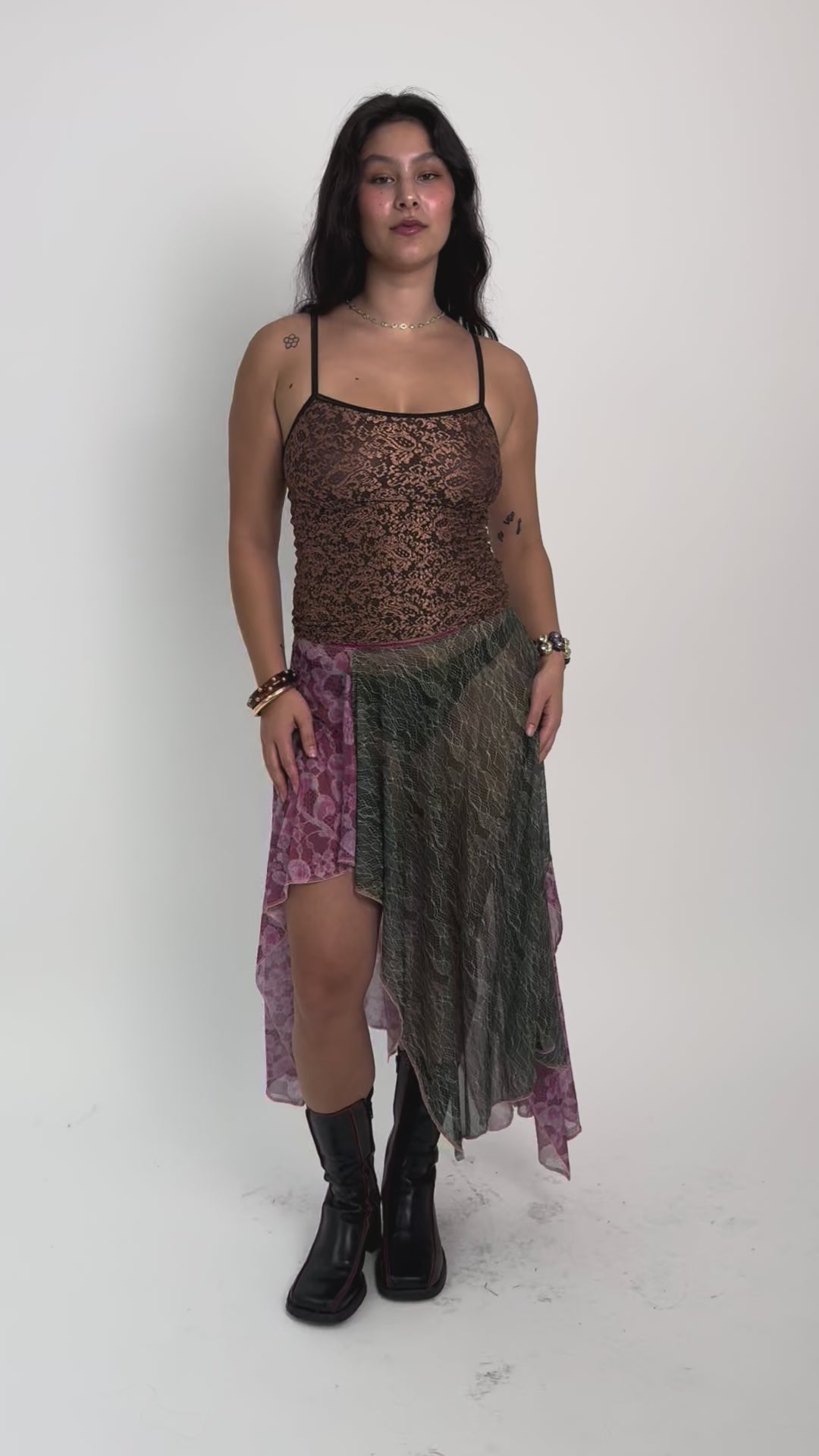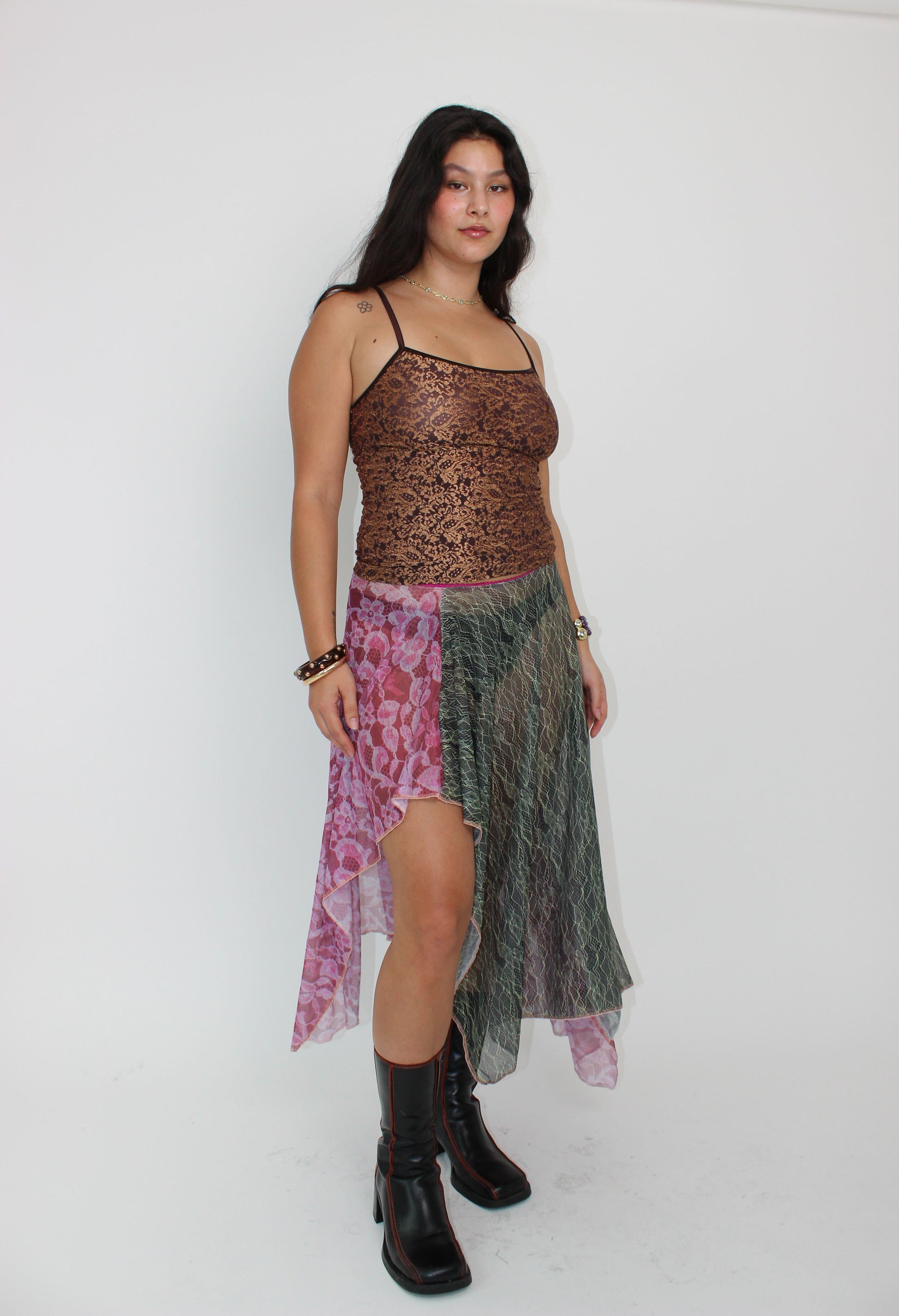 The Fairy Lace Skirt is crafted from our two new lace prints, made in a super soft mesh. Designed with an asymmetric cut and handkerchief hem, it has a semi-sheer finish that can be styled with bicycle shorts for coverage or layered over jeans for a statement look. Finished with a pink lace waistband for a playful contrast.