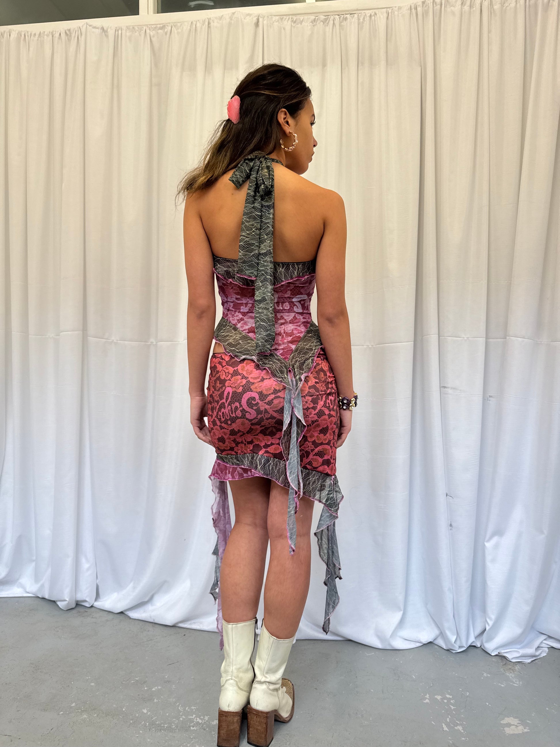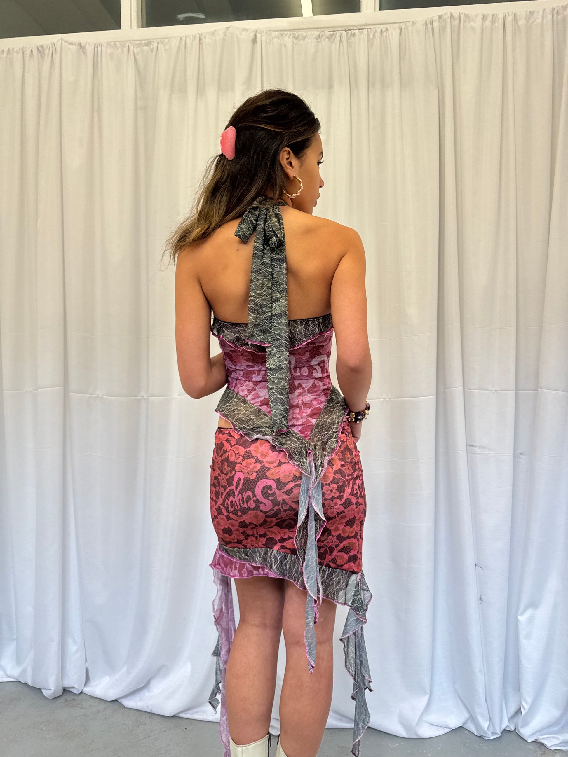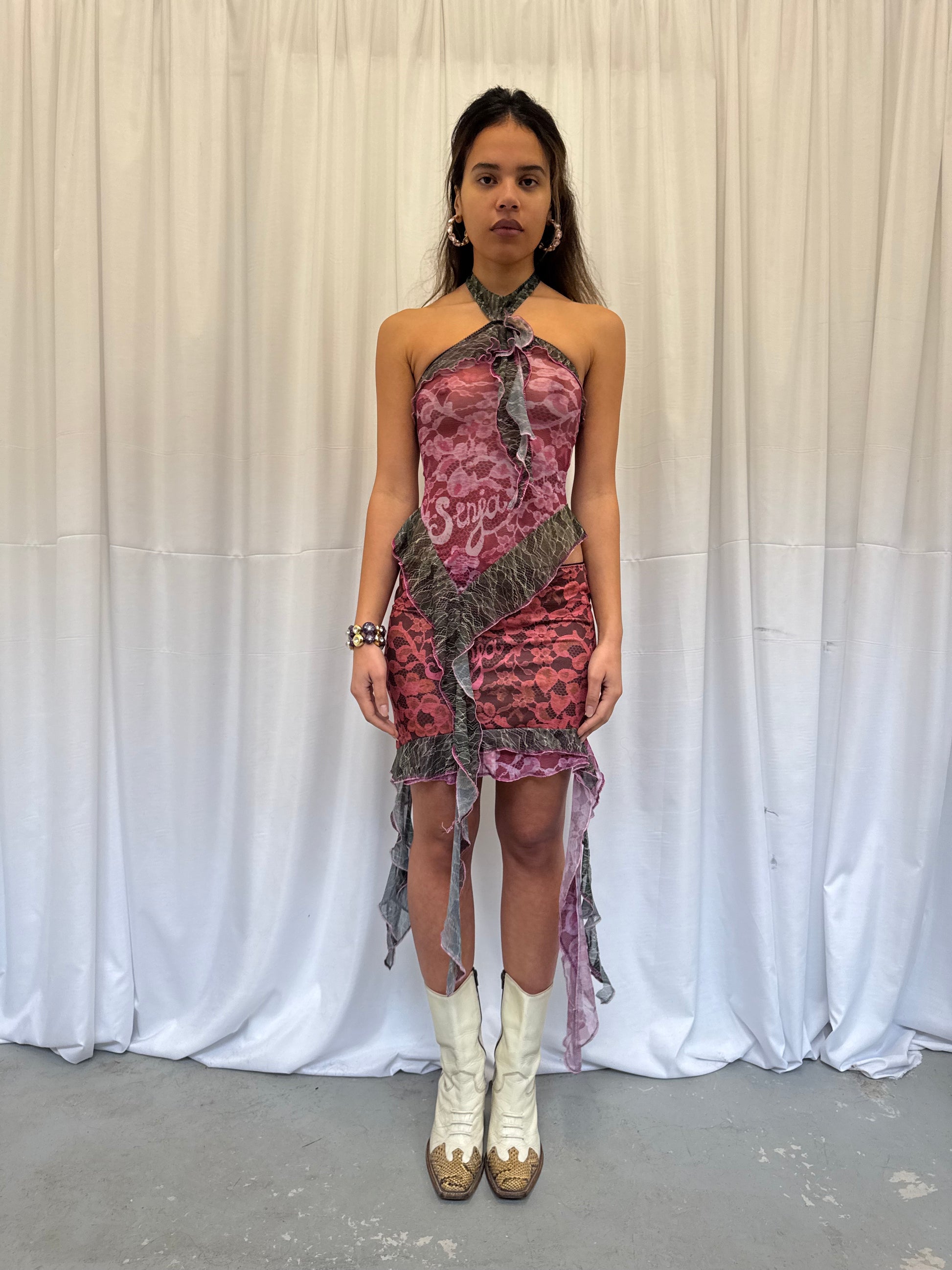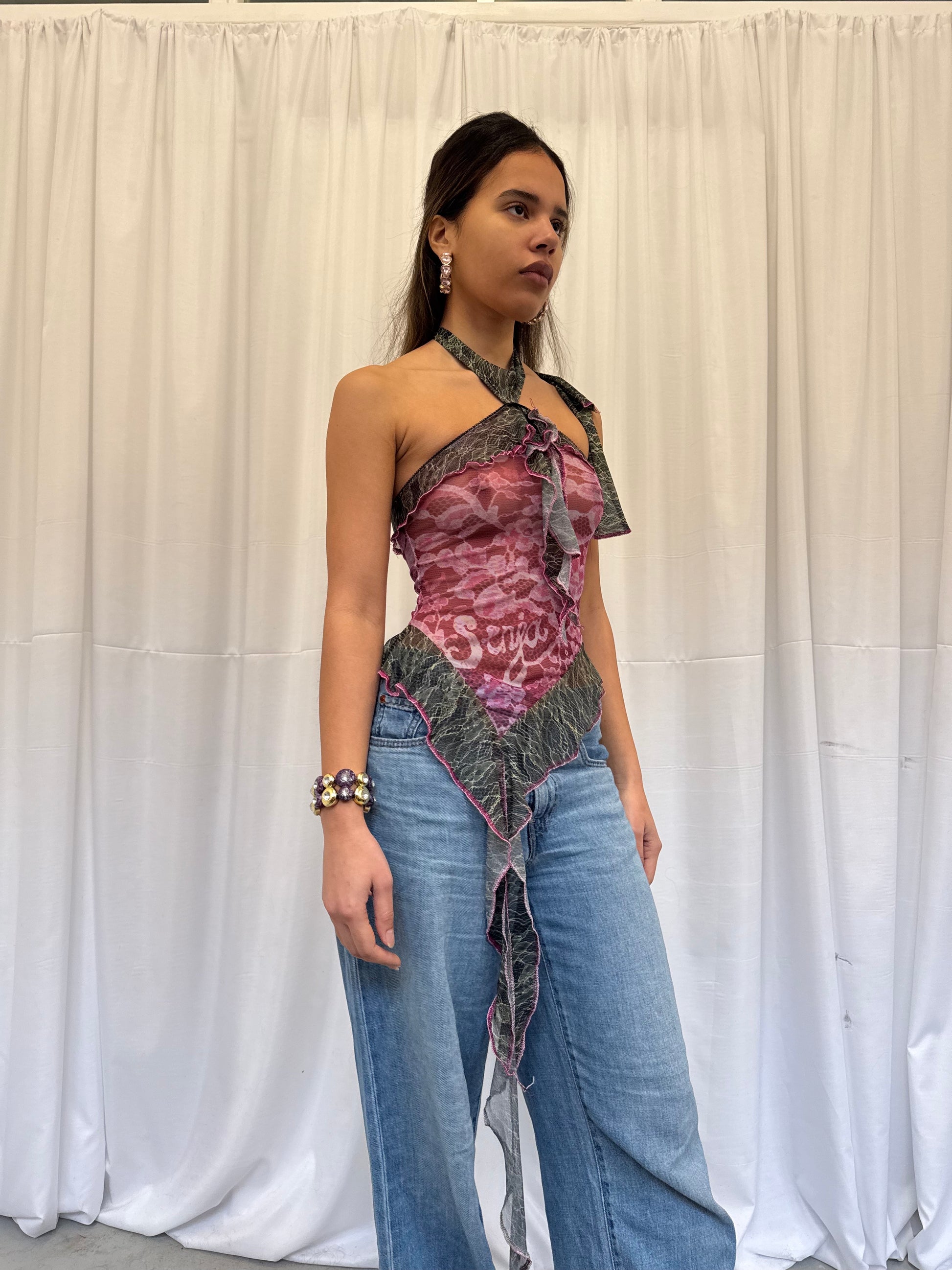 A lace ruffle halter top made in soft mesh fabric, featuring an asymmetric hem with a tie bow detail. Made to order with a 7-day production time, each top is handmade in the Senja by Maddie studio and can be customised in length and fit.