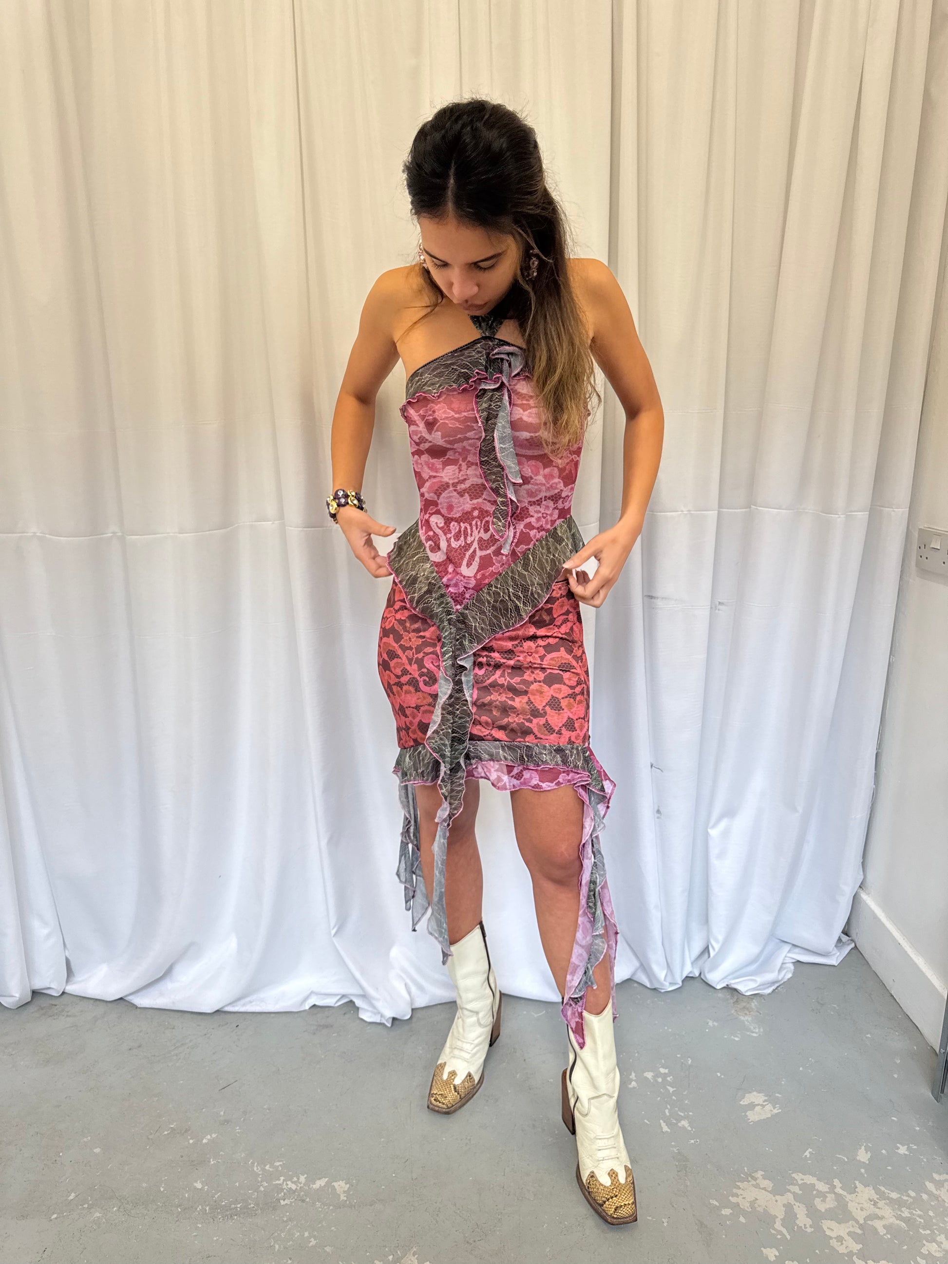 • Asymmetric black mesh lace ruffle