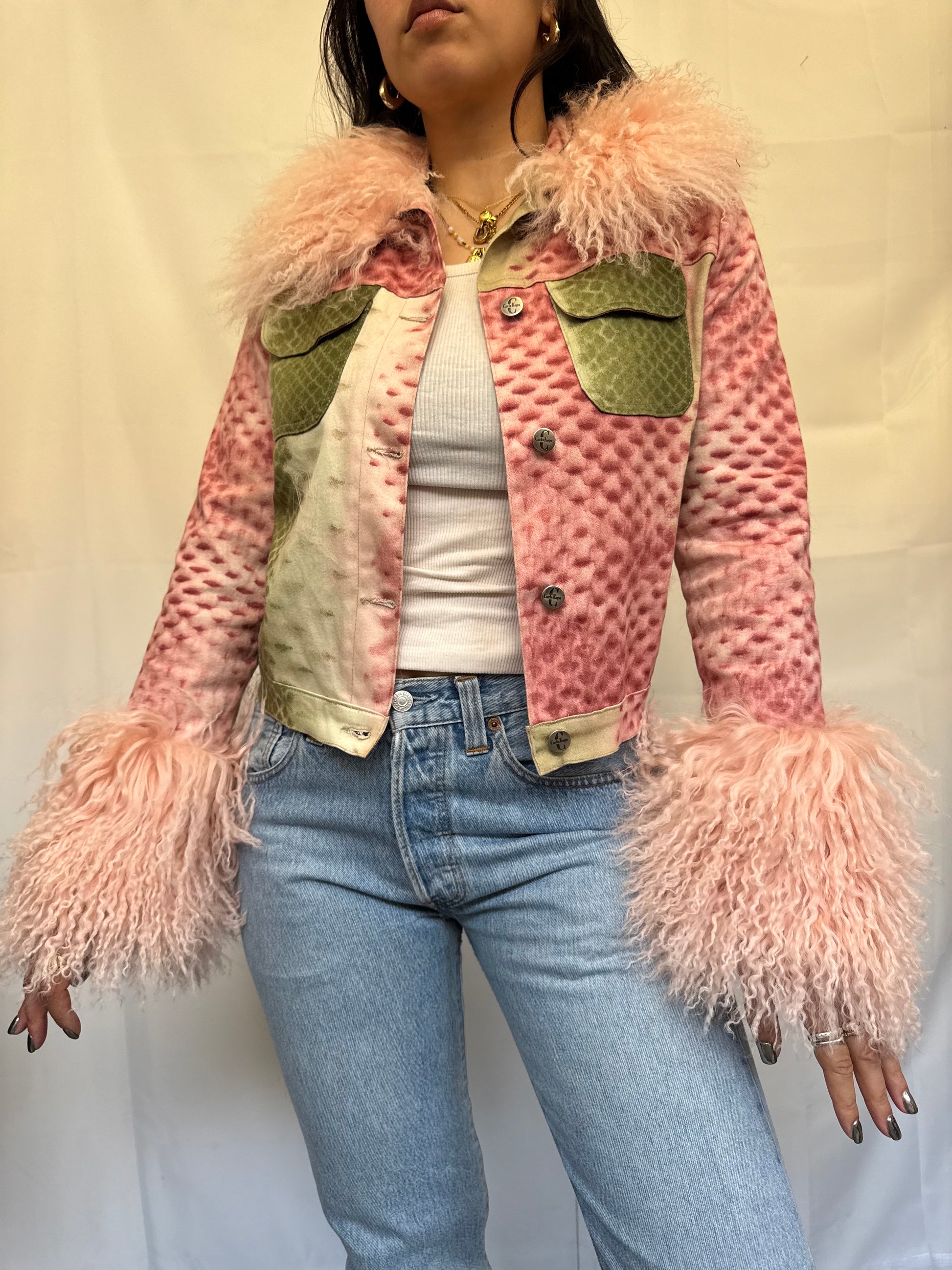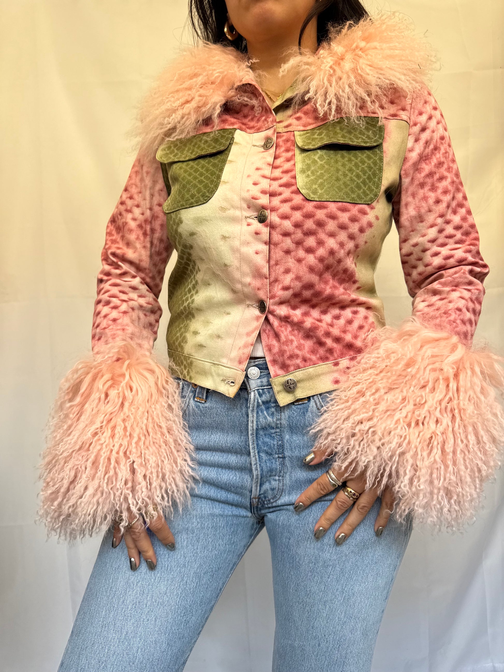 A gorgeous, unique statement piece. Crafted from printed cotton in a unique pink and green animal print, this upcycled 1/1 jacket features baby pink Mongolian wool trims at the collar and cuffs