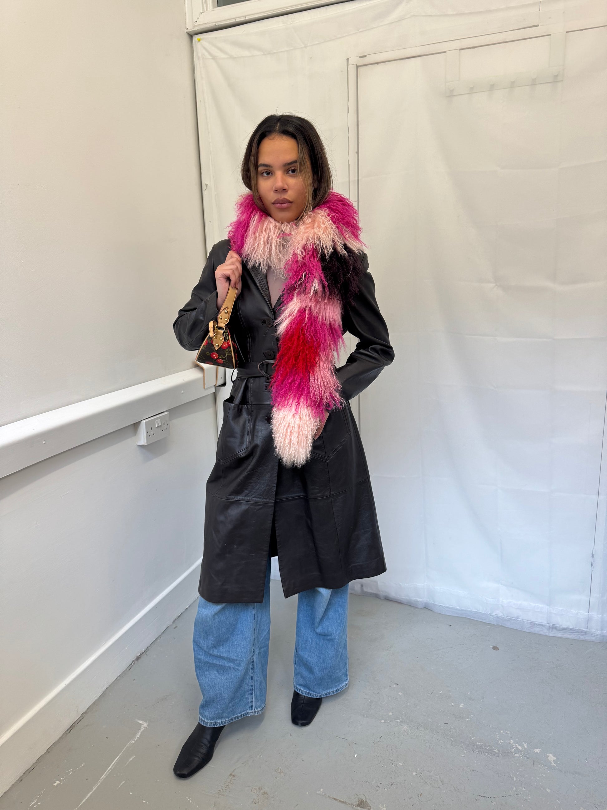 A super soft Mongolian wool scarf, made using a selection of pink and red colours patchworked together. This 1/1 piece celebrates slow fashion, making the most of our fabric scraps to create something beautiful and unique.