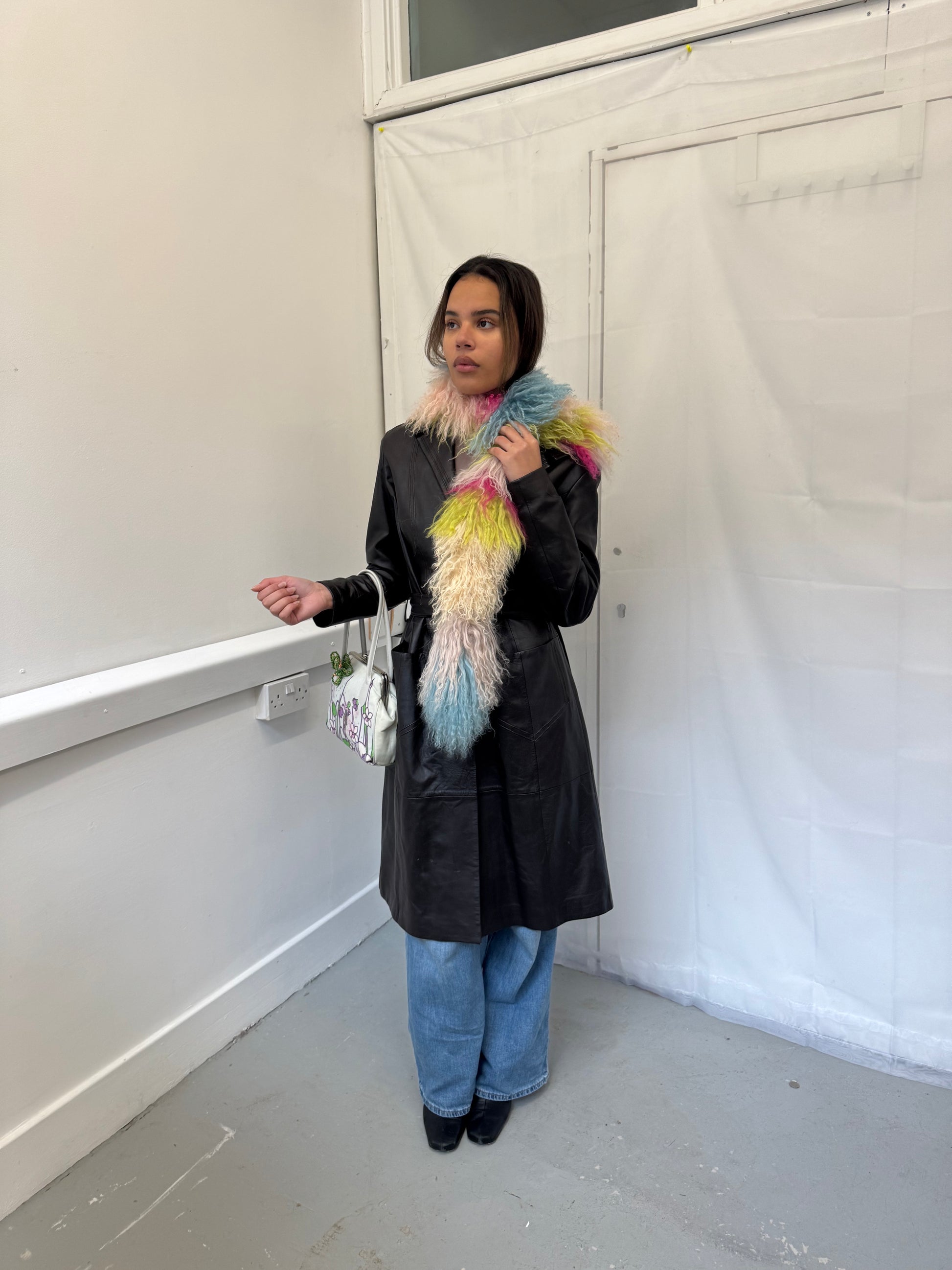 A super soft Mongolian wool scarf, made using a selection of different colours patchworked together. This 1/1 piece celebrates slow fashion, making the most of our fabric scraps to create something beautiful and unique.