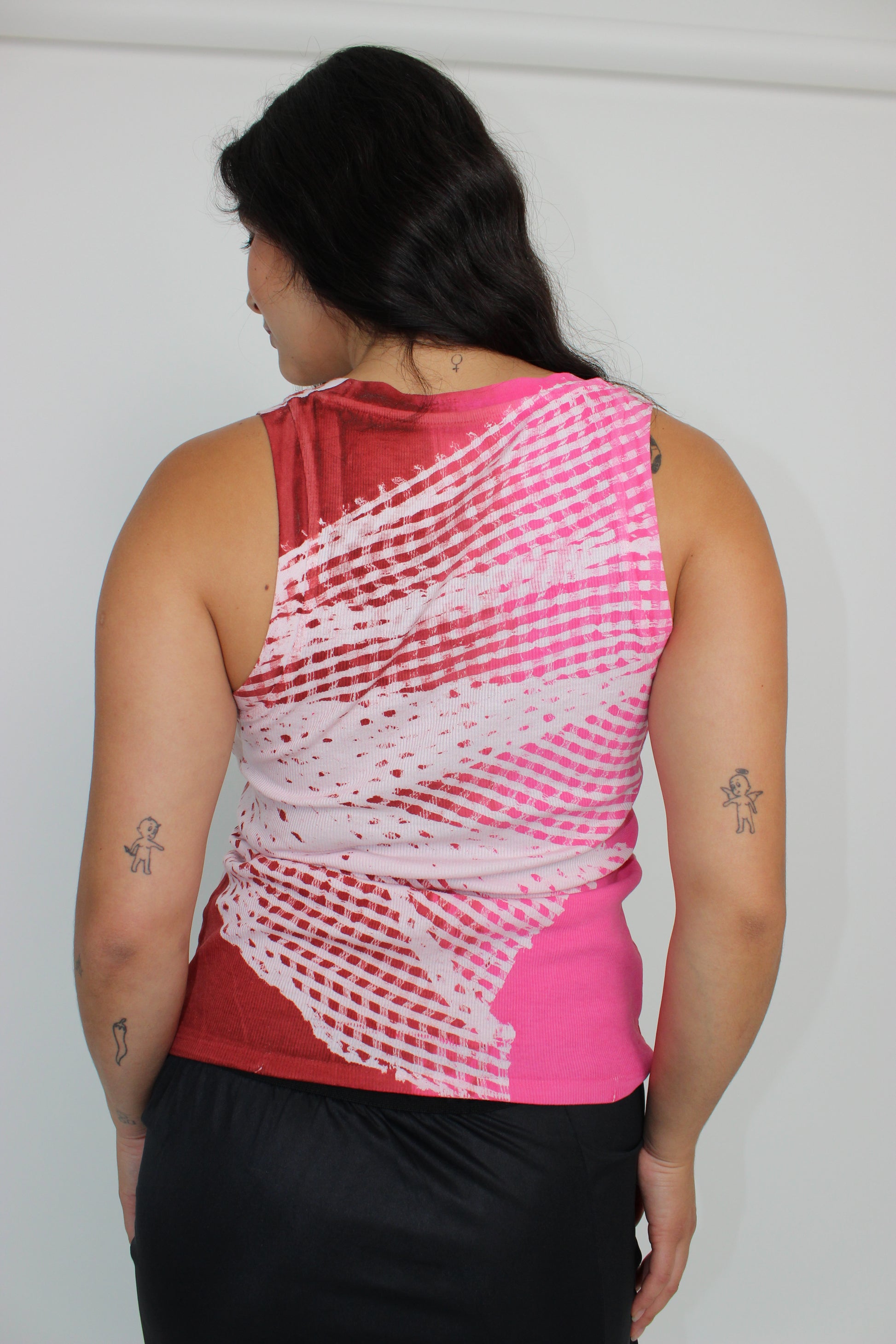 A one-of-one upcycled vest featuring a textural screen print in an ombré pink-to-red finish. The print adds dimension and creates a bold, graphic effect. Reworked from reclaimed materials and handmade in the Senja by Maddie studio.