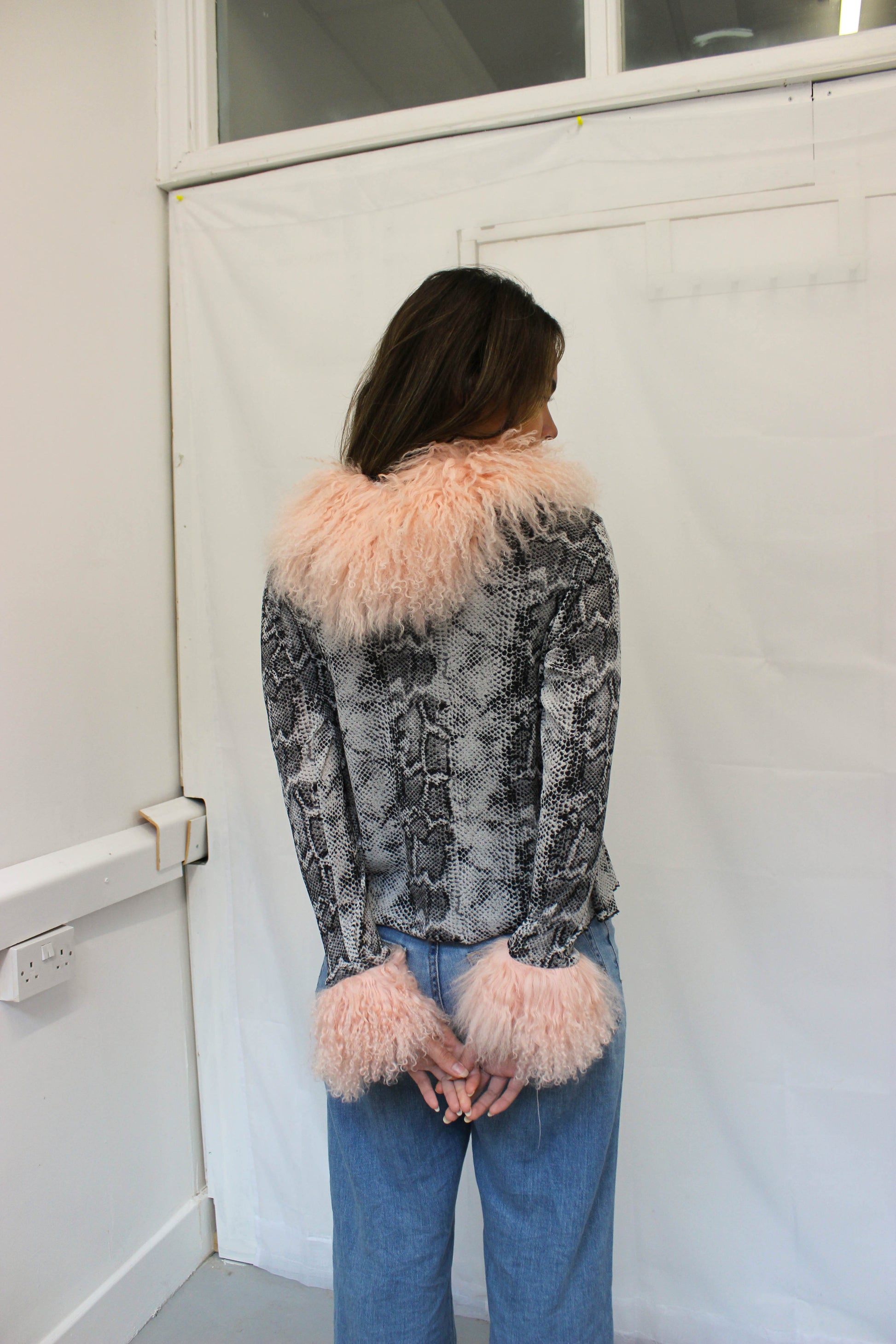 A mesh snake-print cardigan finished with soft baby-pink fluffy trims. A second-hand piece upcycled in our London studio with Mongolian fluff.