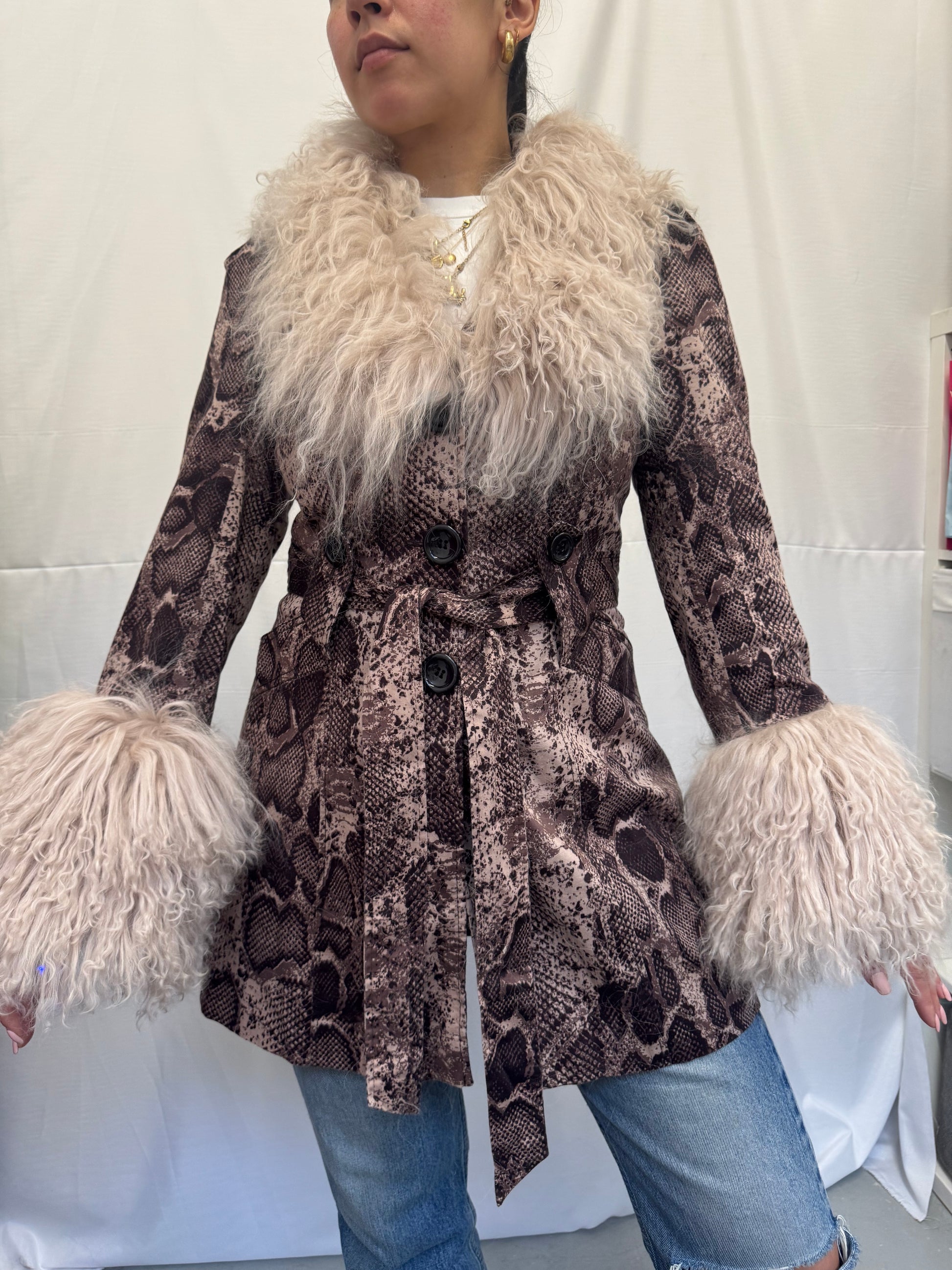 Snake Skin Trench Coat with Oyster Grey Mongolian Cuffs