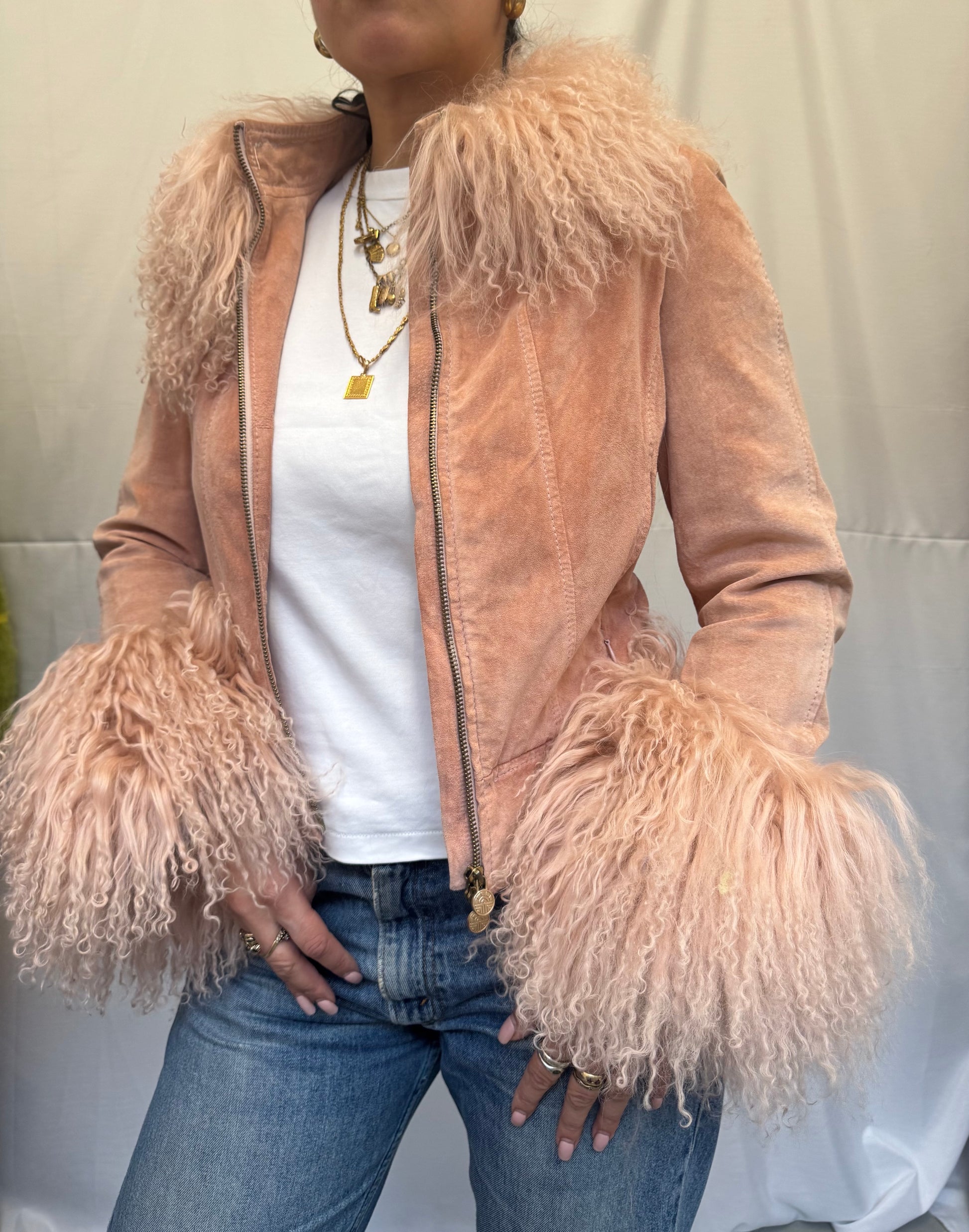 Baby Pink Suede Jacket with Mongolian Wool Trims