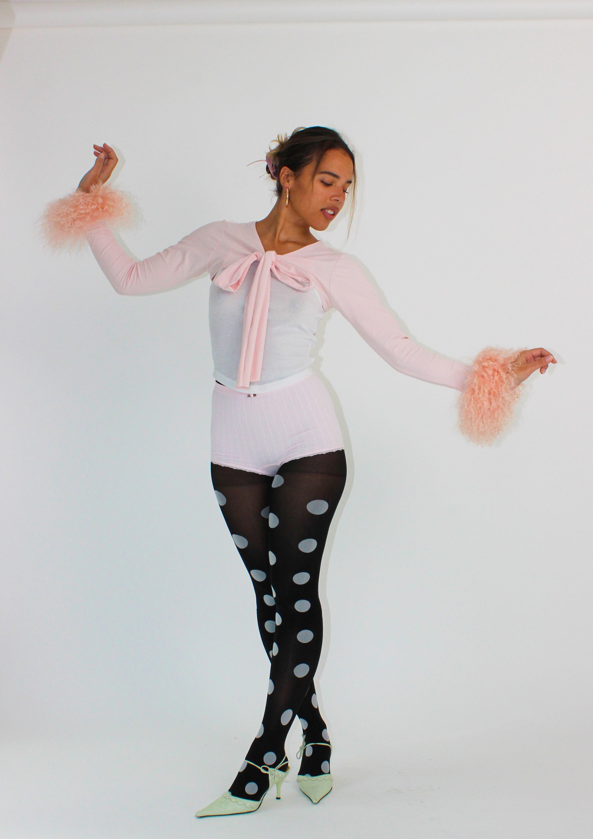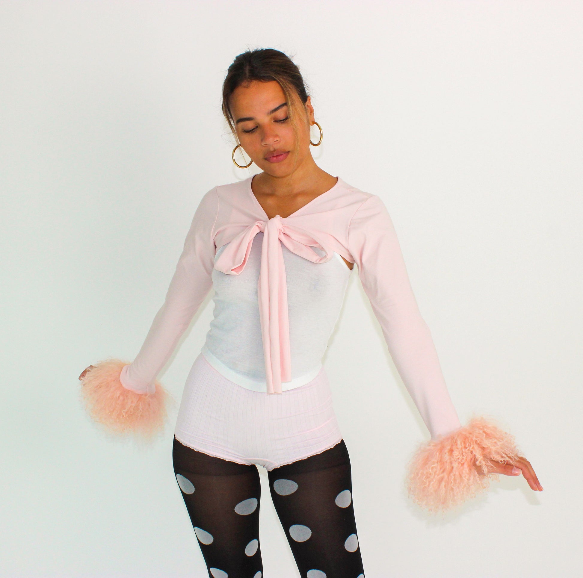 A soft jersey bolero with a ballet-inspired twist. This baby pink layer features extra-long ties that can be wrapped and crossed or tied in a bow. Featuring fluffy Mongolian wool cuffs in baby pink. Lightweight yet cosy, it’s the perfect autumnal layer to elevate any look.