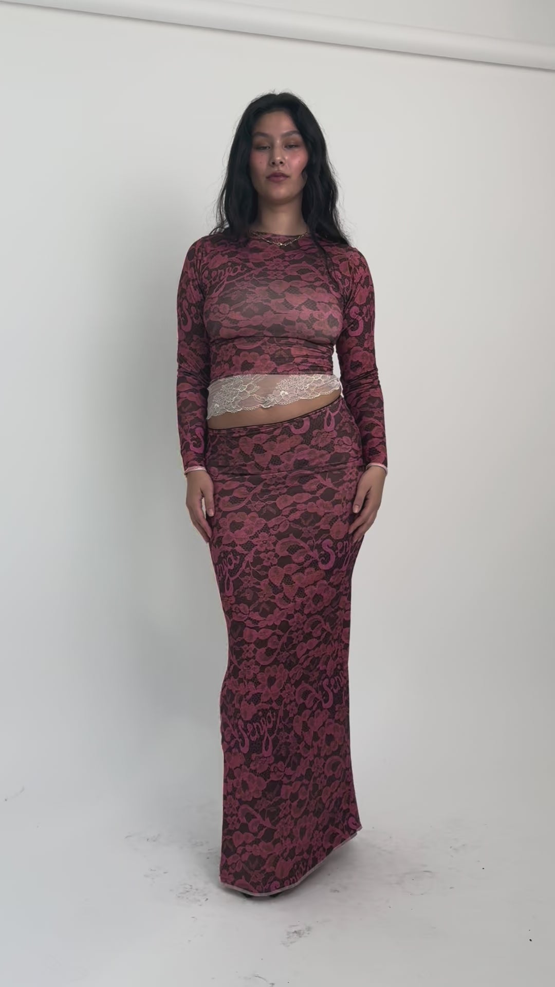 The Burgundy Lace Long Sleeve Top is made in our new Senja lace print. Designed with a round neckline, cream lace trim, and long sleeves sleeves, this piece offers a romantic and versatile silhouette. Pair it with the matching lace maxi skirt for the full look.