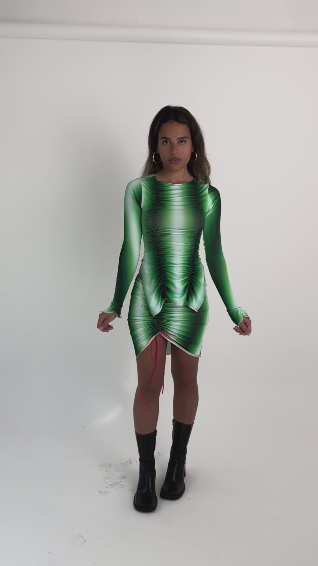 A ruched mini skirt in our green ombre print. This versatile piece features an adjustable side ruche, allowing the length to be worn from just above the knee to mini length. Finished with a black elastic waistband for comfort and fit, it’s designed in our striking green ombre gradient. Perfect styled on its own or as pair with the matching top.