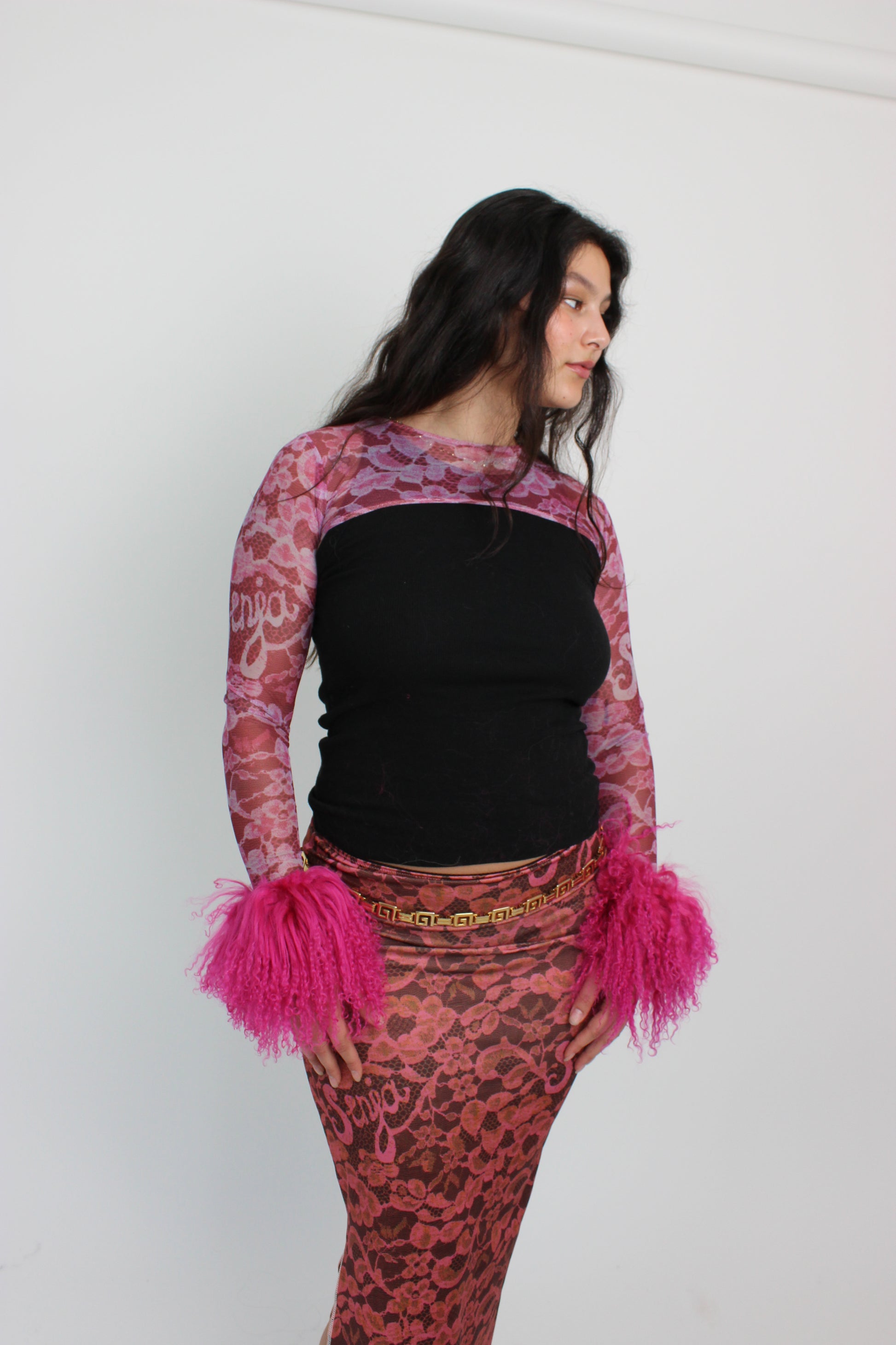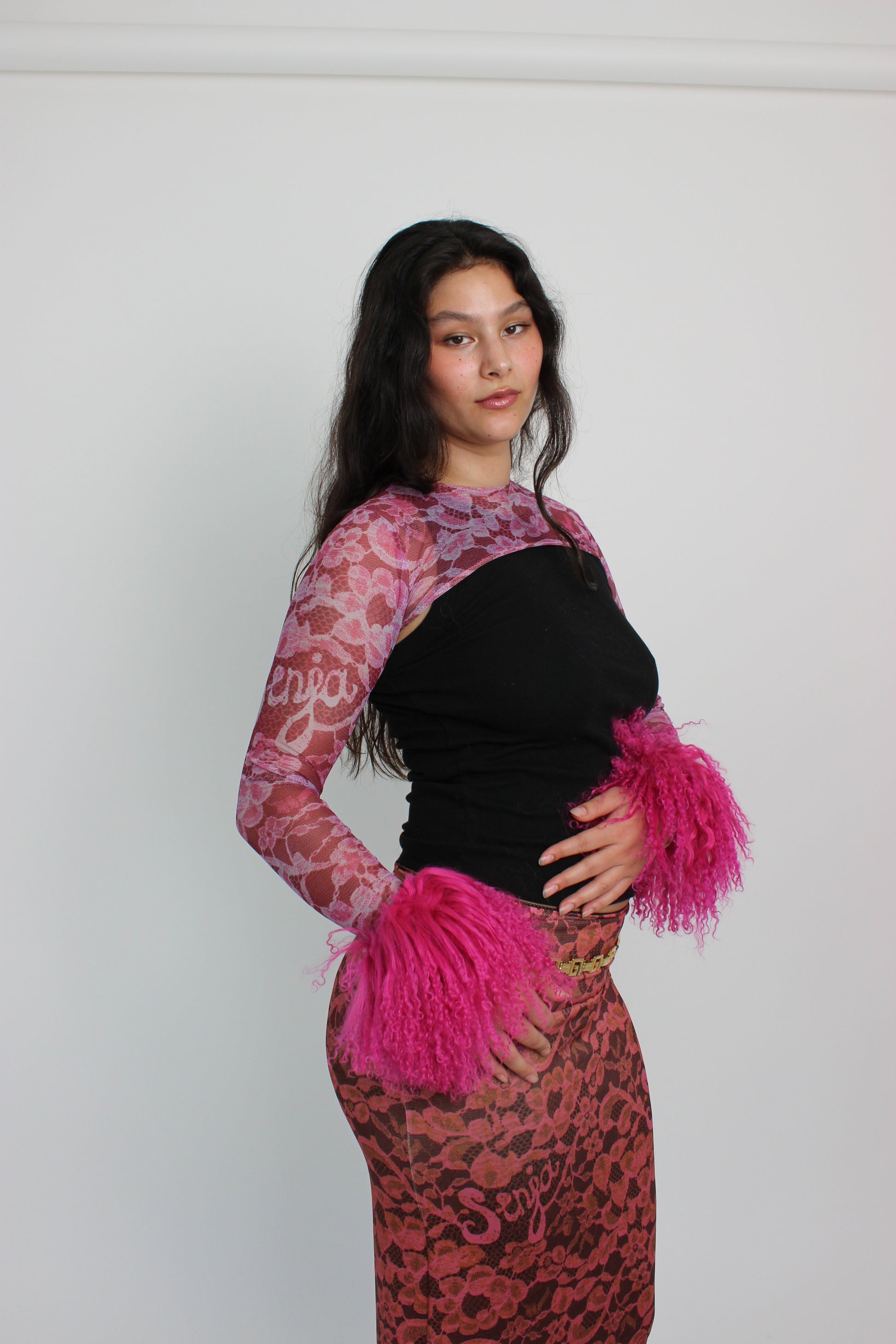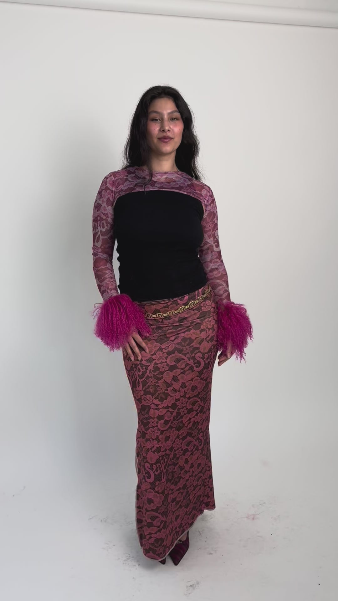 The Lace Mesh Sleeves are a signature Senja style, reimagined in our new lace print. Designed as a lightweight layering piece, this bolero-style top features long fitted sleeves finished with hot pink fluffy trims. Paired here with The Burgundy Lace Maxi Skirt.