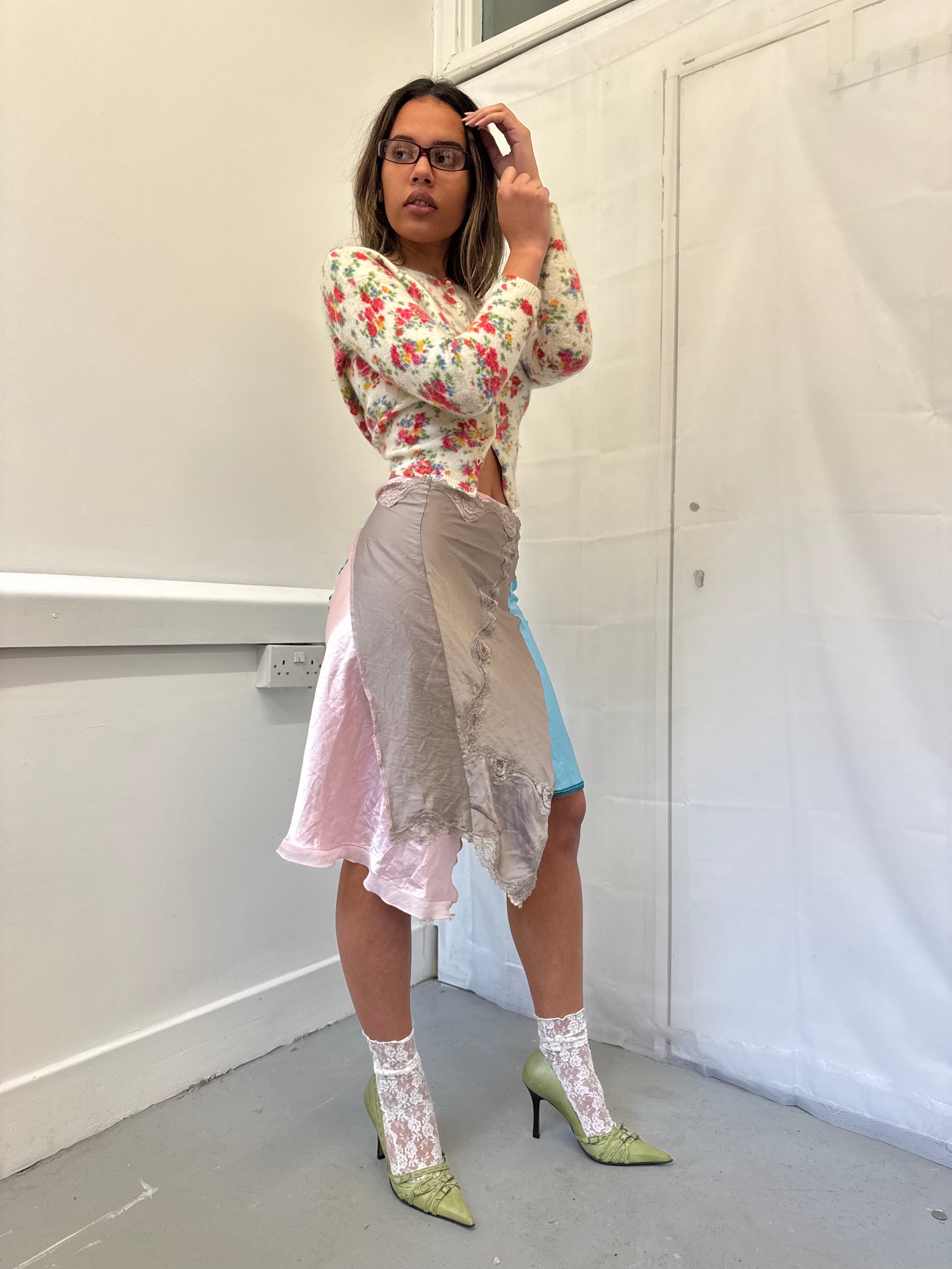 A one-of-one wrap skirt made from upcycled blue, grey and pink second-hand slips. This lightweight piece can be worn and tied in multiple ways, allowing for adjustable fit and styling. Handmade in the Senja by Maddie studio using reclaimed materials.