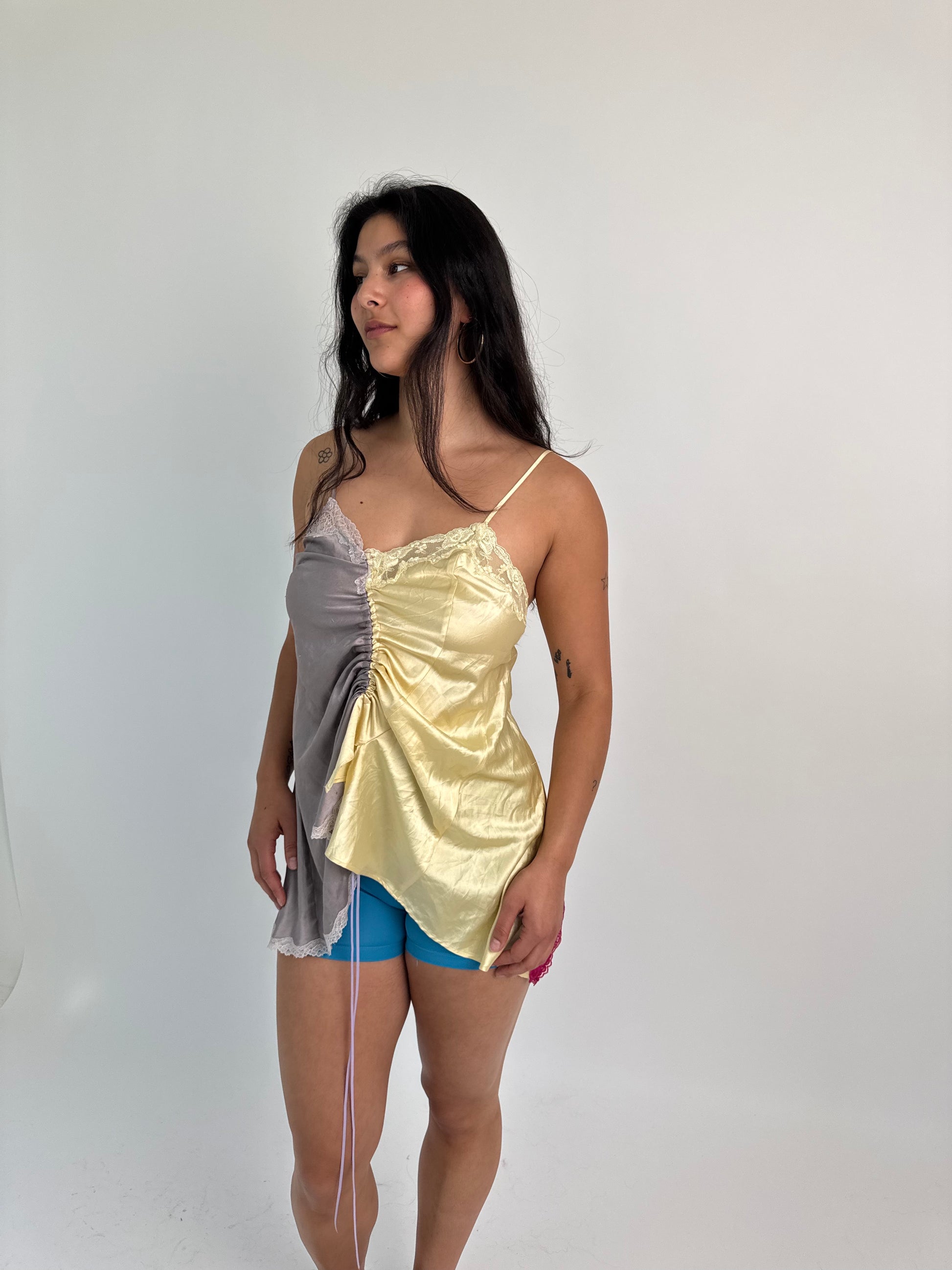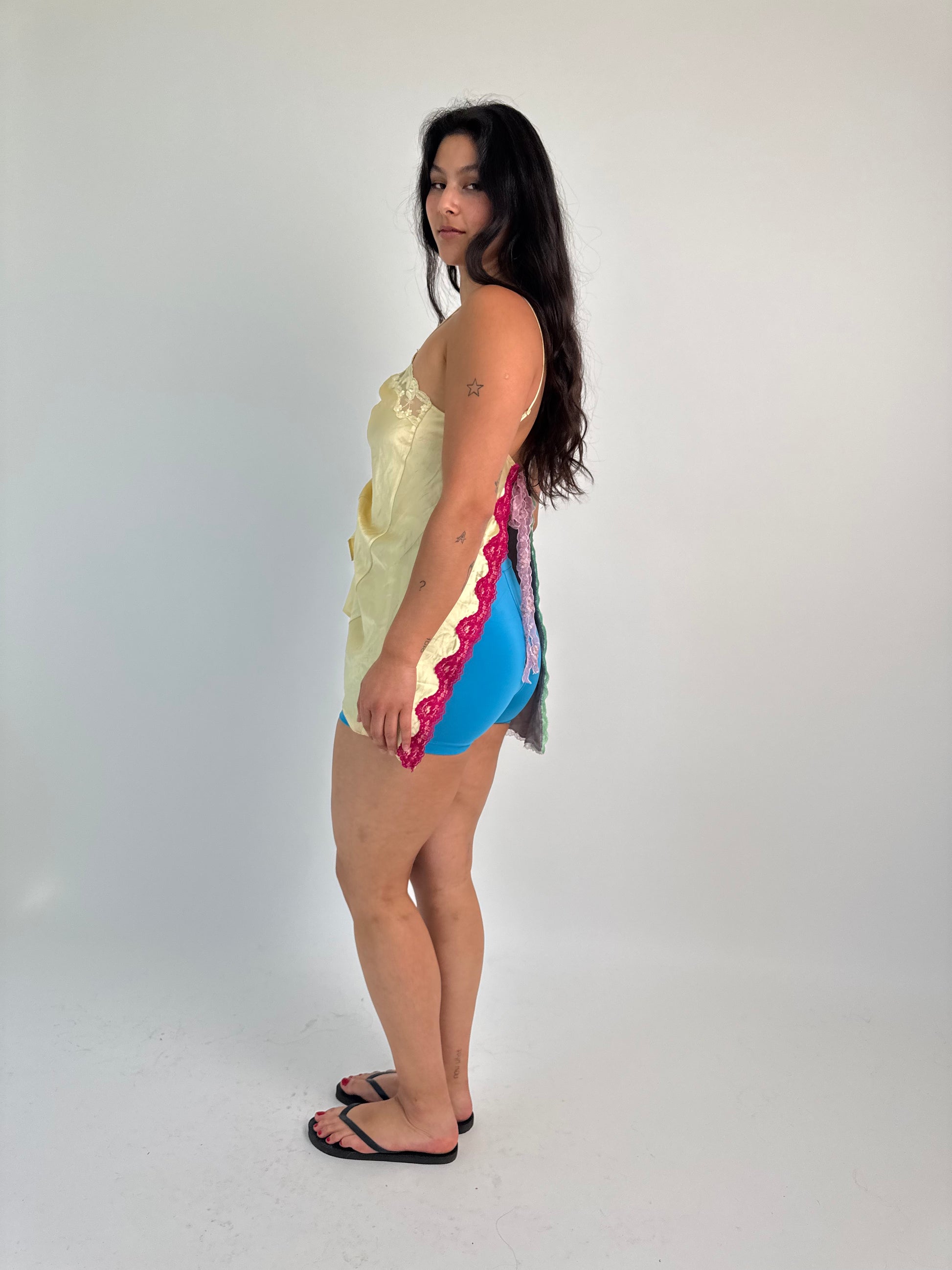 A one-of-one skirt made from upcycled pink second-hand slips. This lightweight piece can be worn and tied in multiple ways, allowing for adjustable fit and styling. Handmade in the Senja by Maddie studio using reclaimed materials.
